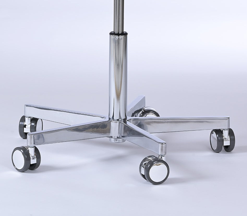 Das Basismodell verfügt über ein stabiles Aluminium-Fußkreuz (Ø 610 mm) in polierter Ausführung sowie eine leichtgängige Aluminium-Ringmechanik. Der Hocker ist 360° drehbar und besitzt eine stufenlose Sitzhöhenverstellung, wodurch sich der Praxishocker flexibel an verschiedene Arbeitssituationen anpassen lässt.